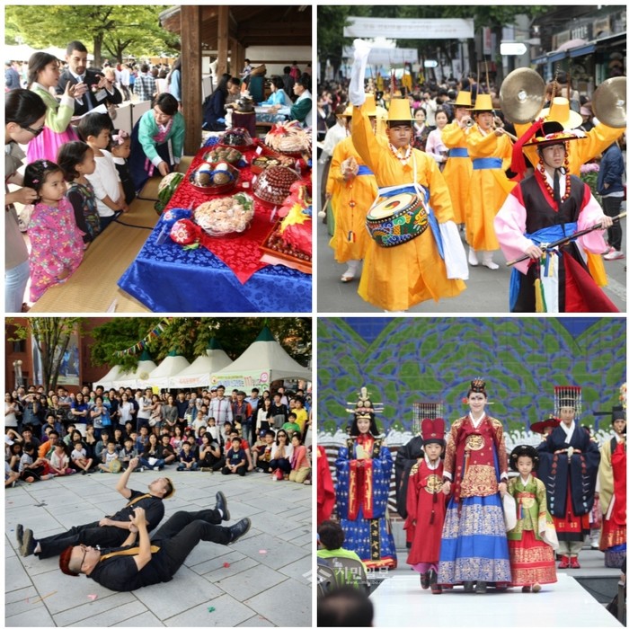| ▲ (오른쪽 위) 지난해 인사동 길에서 실시된 전통의상 퍼레이드. ▲(오른쪽 아래) '인사전통문화축제'에 참가한 한 외국인이 궁중전통의상을 입고 아이들과 함께 서 있다. ▲(왼쪽 위) 지난해 열린 ‘궁중과 사대부가 전통음식 축제’를 방문한 주민들과 관광객들이 상에 차려진 사대부가의 전통음식을 구경하고 있다. ▲(왼쪽 아래) 'D.FESTA 대학로거리공연 축제'에 참가한 한 공연팀이 공연을 펼치고 있다. |