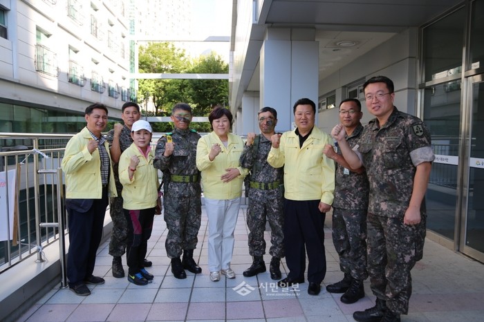 지난 8일 육군 제7688부대 2대대 전술훈련장을 방문한 구로구의회 의장단이 위문품을 전달한 후 관계자들과 함께 파이팅을 외치며 단체촬영을 하고 있다.(사진제공=구로구의회)