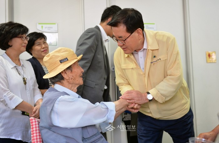 서울 동대문구가 지난 9일 오후 2시 동대문구치매지원센터에서 '기억키움학교 개소식'을 진행했다. 이날 유덕열 구청장(오른쪽)이 치매 예방과 극복을 바라며 한 노인에게 격려를 전하고 있다.(사진제공=동대문구청)