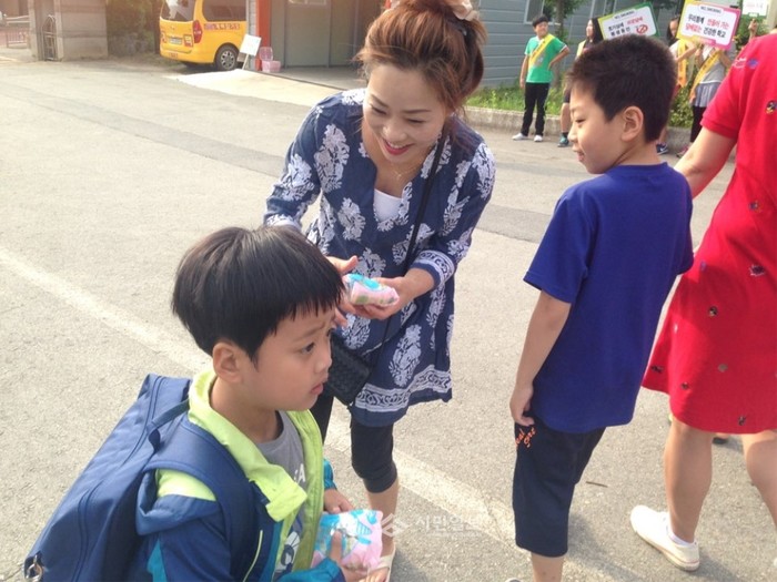 전남 영암군 시종초등학교는 최근 '학교폭력예방 캠페인'의 일환으로 학부모로 구성된 '마미캅스'를 운영했다. 사진은 마미캅스가 등굣길 아이들에게 간식을 나눠주며 인사하고 있는 모습.(사진제공=전남교육청)