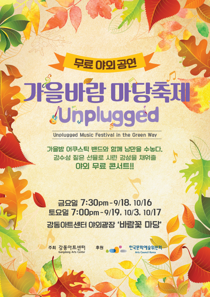 오는 9월 18일~19일, 10월 3일, 10월 16일~17일 총 5일 동안 강동아트센터 야외 바람꽃 마당에서 펼쳐지는 <가을바람 마당 축제 _Unplugged>에 ‘해바라기’, ‘봄 여름 가을 겨울의 김종진’, ‘웨일&더문’, ‘장필순 밴드’, ‘고상지 밴드’, ‘정원영 밴드’, ‘노영채&염종성’이 출연하여 가을에 어울리는 어쿠스틱 감성을 한 것 불어넣을 예정이다. 특히 강동구 지역단체인 ‘코리아 팝스 오케스트라’와 강동아트센터 상주단체인 ‘모스틀리 필하모닉 오케스트라’가 풍성한 소리로 관람객에게 잊지 못 할 아름다운 밤을 선사한다.