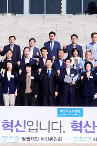 10일 서울 여의도 국회 본청 앞 계단에서 열린 새정치민주연합 자치분권민주 지도자회의 ‘혁신안 실천을 촉구하는 결의대회’에서 김상곤 혁신위원장과 위원 등 참석자들이 구호를 외치고 있다.