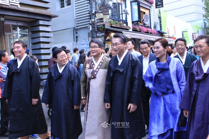 지난 12일 서울 종로구 인사동에서 열린 '제28회 인사전통문화축제 거리 퍼레이드' 에 참석한 김복동 종로구의회 의장과 김영종 종로구청장(왼쪽 2번째 4번째), 관계자들이 한복을 입고 인사동 거리를 걸으며 이야기를 나누고 있다. (사진=이대우 기자)