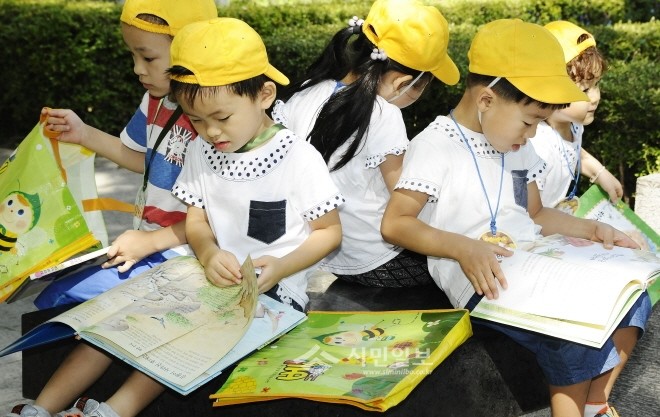 서울 광진구가 지난 9~11일 광진문화예술회관 분수광장에서 '알뜰도서 무료 교환시장'을 열었다. 사진은 지난 10일 교환시장에서 어린이들이 자신이 고른 책을 읽고 있는 모습.(사진제공=광진구청)