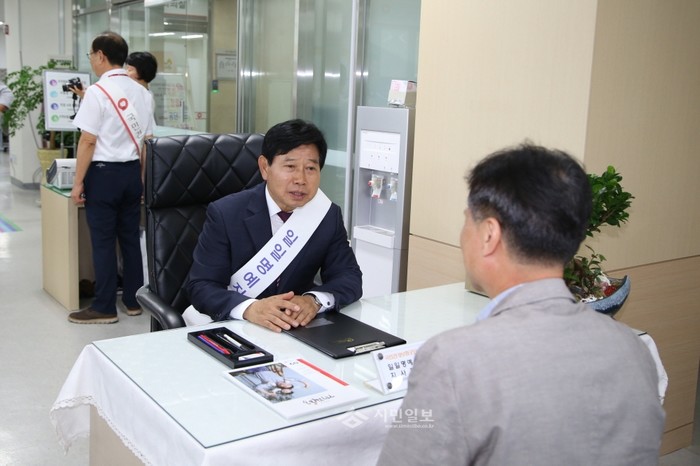 정병재 서울 금천구의장은 지난 10일 국민건강보험공단 금천지사 일일명예 지사장에 위촉돼 하루 동안 국민건강보험공단 업무를 체험했다. 사진은 정 의장이 일일명예 지사장 업무를 수행하는 모습.(사진제공=금천구의회)