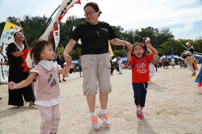 광진구는 지난 12일 구의2동 동의초등학교에서 지역주민의 소통과 화합을 위한 '뛰놀자 한가위' 마을축제를 진행했다. 사진은 마을축제에 참여한 가족이 사물놀이를 즐기고 있는 모습.(사진제공=광진구청)