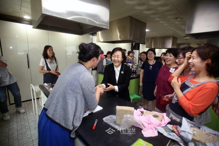 최근 서울 강남구 여성능력개발센터에서 열린 ‘2015년 취·창업 박람회’에 참석한 신연희 구청장이 참가자들을 방문해 손을 맞잡고 격려인사를 하며 이야기를 나누고 있다.(사진제공=강남구청)
