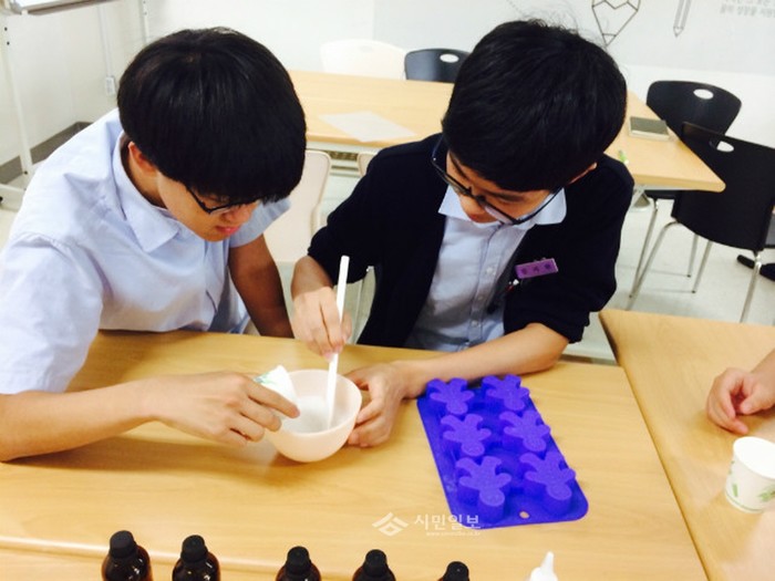 | ▲ 동대문구 진로·직업 체험지원센터 '와락'이 운영하는 직업 체험 실습 프로그램 '진로별자리'에 참여한 학생들이 아로마 테라피스트가 되어 향초를 만들고 있다. | ||