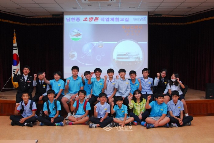 경기 하남소방서는 지난 14일 대회의실에서 미래 소방관을 꿈꾸는 남한중학교 학생들에게 소방관에 대한 체험의 기회를 제공하기 위해 '소방관 직업체험교실'을 진행했다. 사진은 청소년들이 기념사진을 찍는 모습.(사진제공=하남소방서)