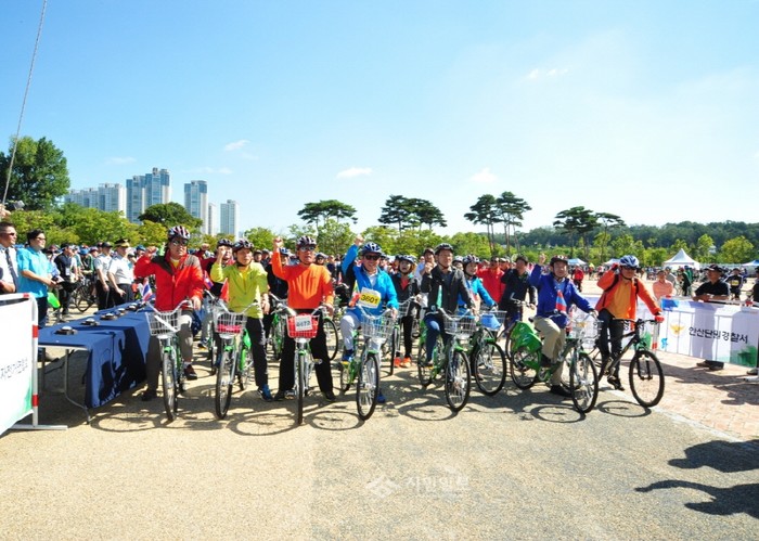 지난 13일 경기 안산시 호수공원에서 다문화 가족과 함께하는 '2015 제2회 안산 World Peace 자전거 대축전'이 열려 제종길 안산시장(가운데)이 참여자들과 함께 자전거를 타고 출발선에서 파이팅을 외치고 있다.(사진제공=안산시청)