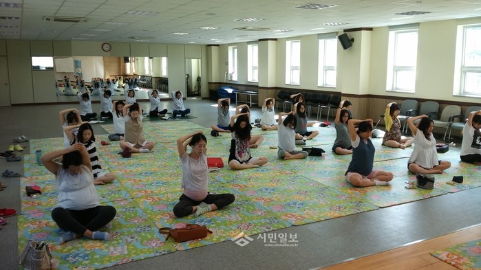 경기 이천시가 최근 임신과 출산에 대한 이해를 돕고 출산 친화적인 분위기를 조성하고자 운영중인 '출산준비교실'에 참가한 임부들이 요가를 배우고 있다. (사진제공=이천시청)