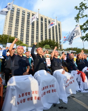 15일 오전 서울 종로구 정부서울청사 앞에서 열린 박근혜의 꼭두각시 노사정야합 조인식 저지 및 대표자 투쟁 결의대회에서 민주노총 임원 등 중앙집행위원회 대표 및 간부들이 삭발식 후 구호를 외치고 있다.