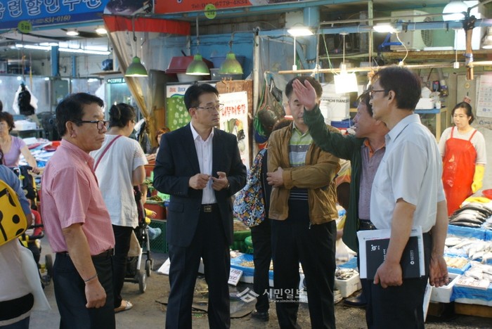 인천 공단소방서는 지난 15일 다가오는 추석 연휴 지역내 전통시장의 화재발생 예방을 위해 옥련전통시장 현장확인에 나섰다. 사진은 소방서 관계자들이 시장에서 안전관리업무 추진 상황에 대해 이야기를 나누고 있는 모습.(사진제공=공단소방서)
