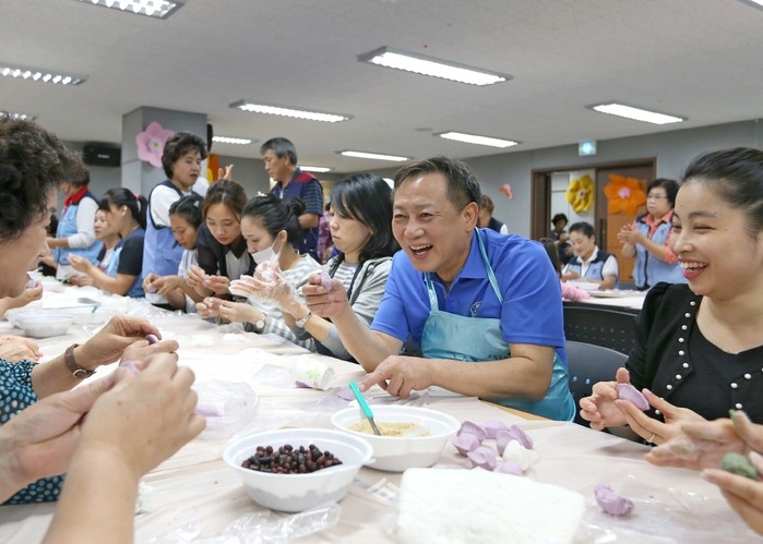 금천구 독산1동 주민센터에서 지난 15일 오전 11시 추석을 맞아 '다문화가정과 함께하는 송편만들기 행사'가 열려 차성수 구청장(오른쪽에서 두 번째)이 참여자들과 함께 송편을 빚고 있다.(사진제공=금천구청)