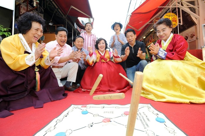 지난 15일 서울 송파구 새마을시장에서 추석을 앞두고 한복을 곱게 차려입은 시장상인들이 시장을 찾은 시민들과 함께 윷놀이를 하며 즐거운 시간을 보내고 있다.(사진제공=송파구청)
