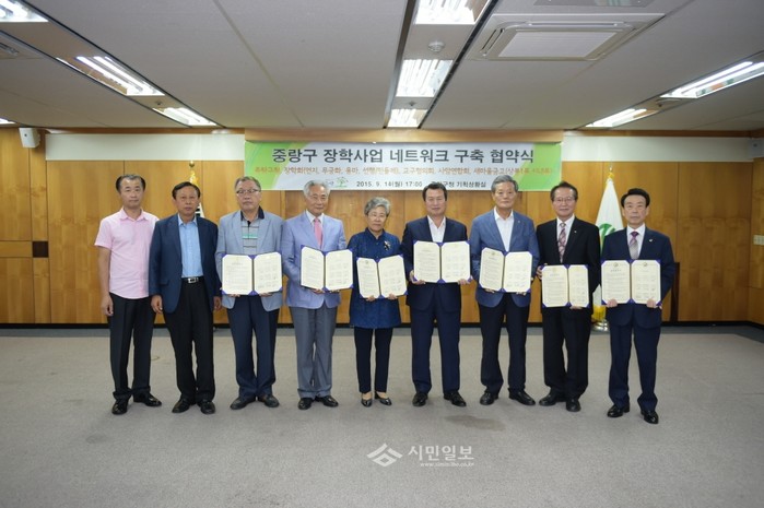 서울 중랑구는 지난 14일 구청 기획상황실에서 장학회 및 장학사업을 추진하고 있는 8개 단체와 유기적으로 연계하기 위한 ‘중랑구 장학사업 네트워크 구축 협약식’을 개최했다. 사진은 협약식에 참석한 나진구 중랑구청장(오른쪽에서 네 번째)과 관계자들의 모습.(사진제공=중랑구청)