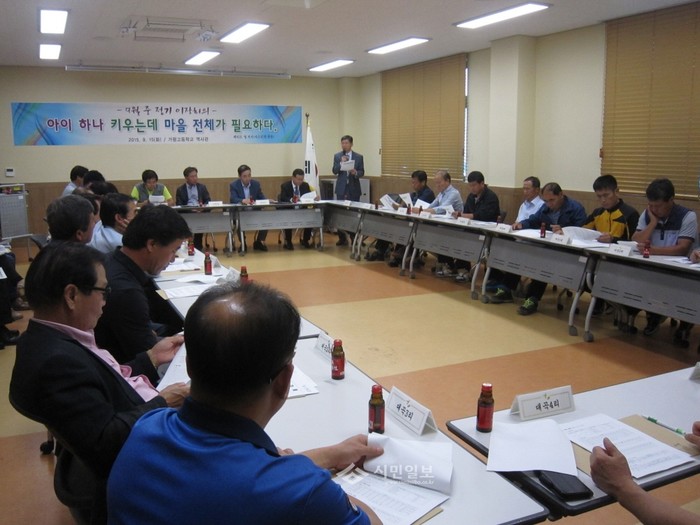 경기 가평군 가평읍 가평고등학교 역사관에서 지난 15일 ‘아이 하나 키우는데 마을 전체가 필요하다’라는 주제로 현장 이장회의가 열려 이장들과 학교관계자들이 논의를 하고 있다.(사진제공=가평군청)