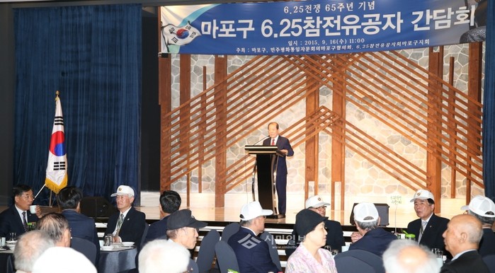 지난 16일 오전 11시 박홍섭 마포구청장이 마포구 신수동 소재 k-turtle에서 열린 '6.25 참전유공자 간담회'에 참석해 인사말을 하고 있다.(사진제공=마포구청)
