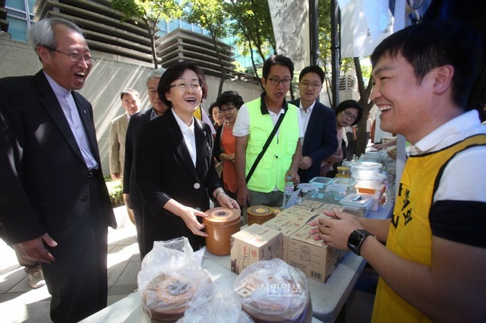 지난 16일 신연희 서울 강남구청장(왼쪽에서 두 번째)이 포스코빌딩 주변에서 열린 ‘착한소비 바자회’에 참석해 한 매대에서 판매 중인 물건을 살펴보고 있다. (사진제공=강남포토)