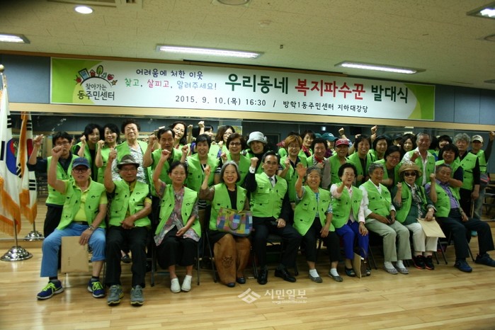 서울 도봉구 방학1동이 최근 방학1동 주민센터 대강당에서 '우리동네 복지파수꾼' 발대식을 개최한 가운데 복지파수꾼으로 참여한 주민 100여명이 기념촬영을 하고 있다. 이들은 앞으로 지역내 복지사각지대를 발굴하고 동주민센터로 신고하는 역할을 맡는다.(사진제공=도봉구청)