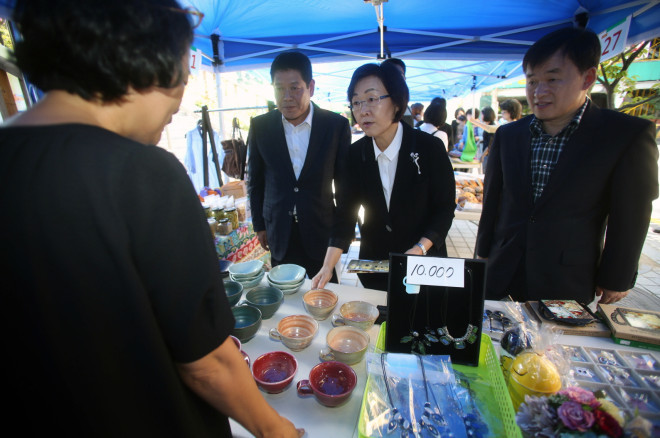 양재천과 연계되는 벚꽃길을 지역명소로 육성하고 상권을 활성화하기 위해 지난 18일 오전 11시 서울 강남구 도곡동 벚꽃길에서 열린 ‘사랑나눔 벼룩시장’에 참석한 신연희 강남구청장(가운데)이 물건을 둘러보고 있다.