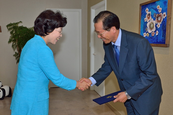 최근 박춘희 송파구청장(왼쪽)이 구청장실에서 창조국방포럼 전문위원으로 활동했던 송원섭씨를 '송파구 안전관리자문위원'으로 위촉하고 악수를 나누고 있다.(사진제공=송파구청)