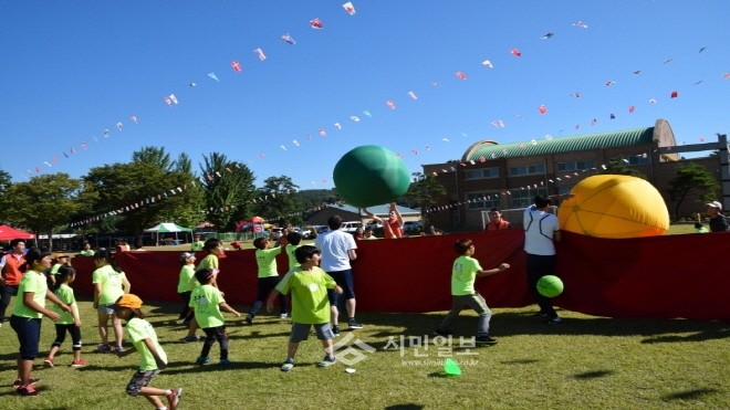 경기 연천군 백학초등학교가 지난 18일 학교, 가정, 지역사회와 함께하는 '백학 가족 어울림 한마당 대축제'를 개최했다. 사진은 축제에 참여한 어린이들이 애드벌룬 배구 경기를 하고 있는 모습.(사진제공=연천군청)