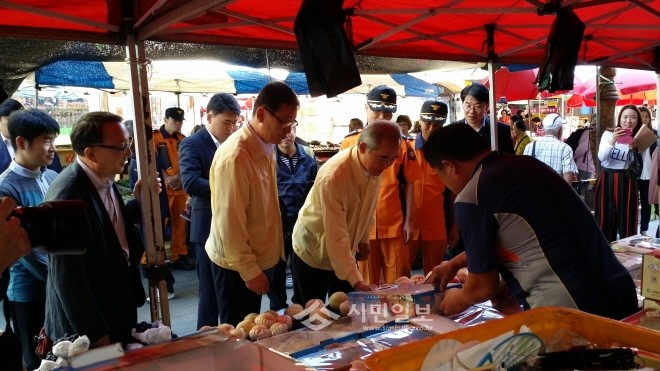이성호 국민안전처 차관이 추석명절을 앞두고 전통시장 상인들의 안전의식 제고와 시장 활성화를 위해 이천 지역내 관고전통시장을 방문한 가운데 상인으로부터 상품 설명을 듣고 있다.(사진제공=이천시청)