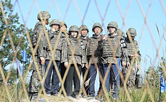 21일 오후 국회 국방위원회 국정감사가 경기도 파주 육군제1사단에서 진행된 가운데 여야 국방위원회 위원들이 북한군 지뢰도발 현장을 시찰하고 있다.