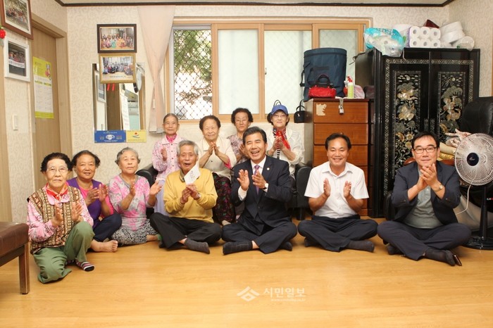 최근 성임제 서울 강동구의회 의장이 ‘10월 경로의 달’을 맞아 암사동에 위치한 경로당 3곳을 방문해 노인들의 안부를 묻고 함께 기념촬영을 하고 있다.(사진제공=강동구의회)