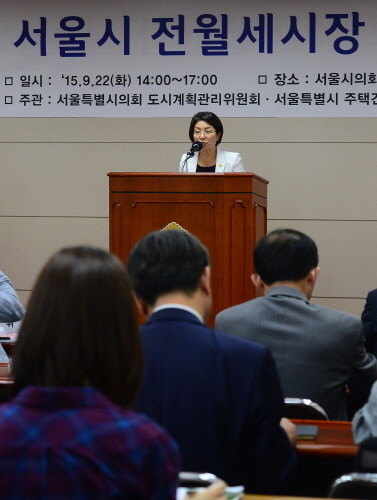 22일 오후 서울 중구 서울시의회 의원회관 대회의실 열린 ‘서울 전·월세시장 토론회’에서 김미경 서울시의원이 개회사를 하고 있다.