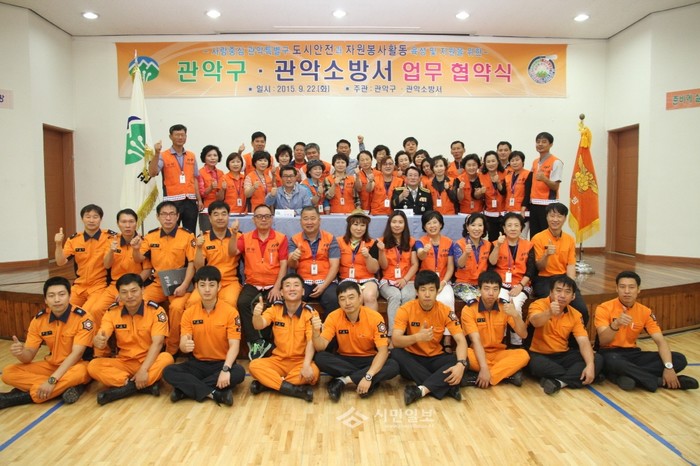 서울 관악소방서는 22일 본서 가람홀에서 관악구와 업무협약을 체결해 재난재해 피해복구와 관악산 안전지킴이, 불우이웃돕기 등의 봉사활동에 대해 양측이 협조하기로한 가운데 협약식에 참여한 관계자들이 기념촬영하고 있다.(사진제공=관악소방서)