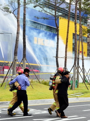 대형 판매시설 화재 및 폭발로 인한 건축물 붕괴·대응·수습·복구를 가상으로 한 '2015년 경기도 긴급구조 종합훈련'이 23일 오전 경기도 광명시 이케아코리아에서 실시돼 소방대원들이 부상자 구조활동을 벌이고 있다. /뉴시스