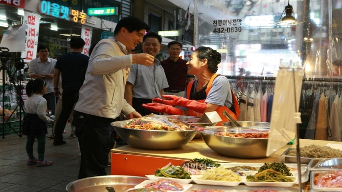 이해식 서울 강동구청장이 추석을 맞아 지난 22일 오후 2시 명일전통시장 등 3개의 전통시장을 방문한 가운데 이 구청장과 시장상인이 서로 환하게 웃고 있다.(사진제공=강동구청)