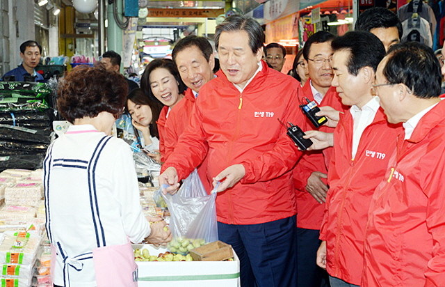 새누리당 김무성 대표와 의원들이 23일 오후 서울 관악구 신사시장을 방문해 상인들과 이야기를 나누며 물건을 사고 있다.