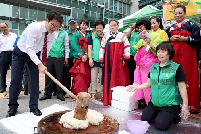 성동구 새마을부녀회는 지난 23일 구청앞 광장에서 '다문화가정 전통문화체험 한마당'을 개최했다. 이날 정원오 성동구청장(왼쪽)이 다문화가족, 새마을부녀회원들이 보는 앞에서 떡메치기를 하고 있다.(사진제공=성동구청)