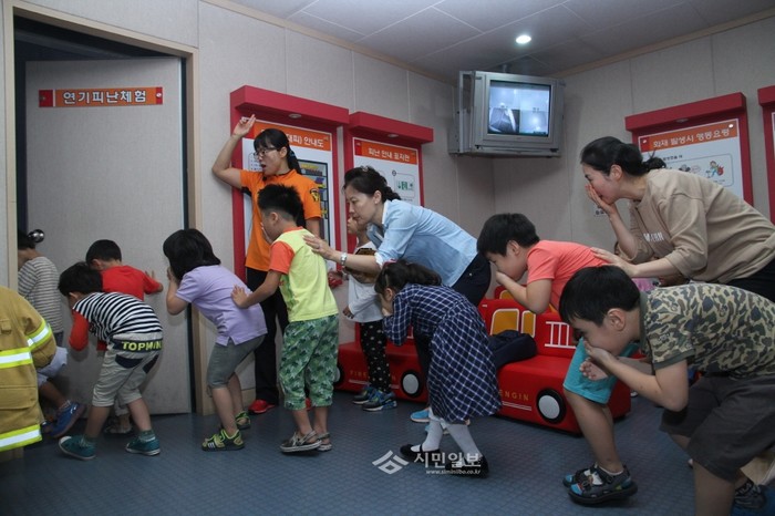 서울 동작소방서는 지난 23일 오전 10시 소방서 3층 소방안전체험교실에서 미가키즈스쿨 어린이 20여명에게 소방안전교육을 실시했다. 사진은 교육에 참가한 어린이들이 코와 입을 막으면서 연기대피체험을 하는 모습.(사진제공=동작소방서)