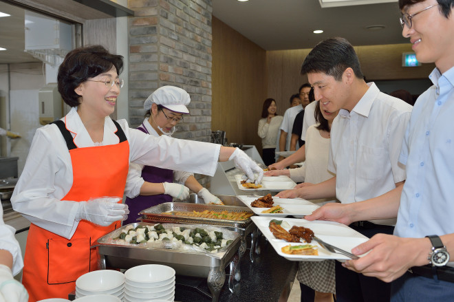 평소에도 구내식당을 자주 애용하기로 소문난 박춘희 구청장은 직원들과 함께 식사를 하며 소통행정을 실천라고 있다.(사진제공=송파구청)