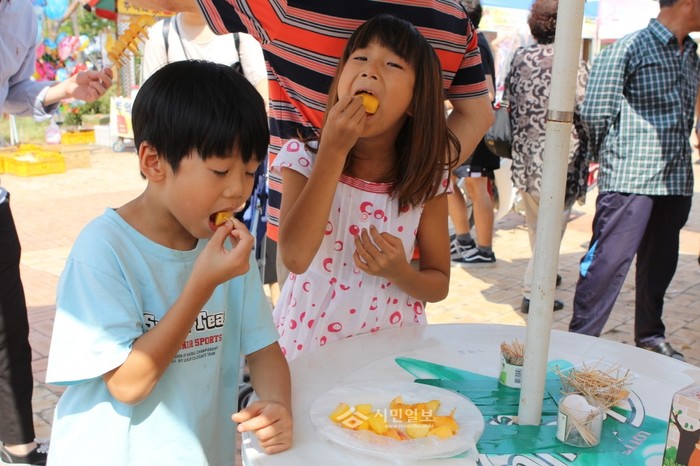경기 이천시 장호원햇사레농산물산지유통센터에서 최근 열린 '제19회 햇사레장호원복숭아 축제' 현장을 방문한 아이들이 복숭아를 맛나게 먹고 있다. 이번 행사는 '복숭아 마을로의 힐링여행'이라는 슬로건 아래 열렸다. (사진제공=이천시청)