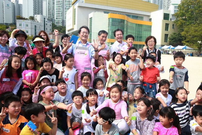 서울 강북구가 지난 23일 ‘학부모가 만드는 창의한마당’을 미양초등학교에서 개최한 가운데 박겸수 구청장(윗줄 오른쪽에서 세 번째), 조희연 서울시교육청 교육감(가운데), 학생 및 학부모들이 기념촬영을 하고 있다.(사진제공=강북구청)