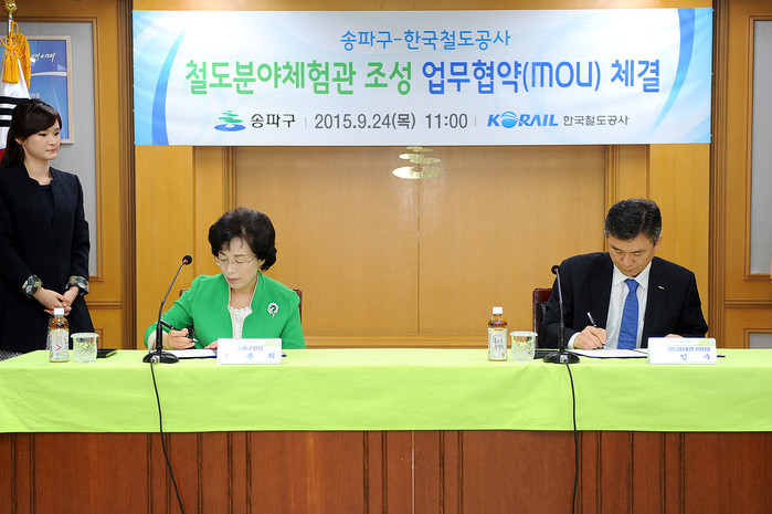 24일 박춘희 서울 송파구청장이 구청 기획상황실에서 ‘교통종합안전체험장 내 철도분야 체험관’ 조성을 위해 한국철도공사와 업무협약(MOU)을 체결했다. 송파구는 내년에 건립예정인 교통종합안전체험장 증축에 있어 한국철도공사가 R&D사업으로 추진 중인 철도안전체험센터를 유치할 예정이다.