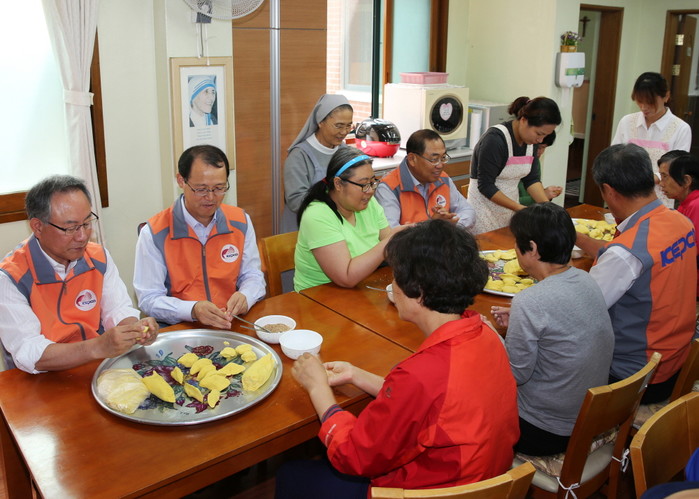 한국전력(사장 조환익, 전국전력노조위원장 신동진)은 지난 24일 추석명절을 맞이하여 경영진과 노조간부 등 60여명이 사회복지시설인 소화자매원(광주 남구)을 방문하여 음식만들기, 산책보조 및 전기차 시승, 환경정화 활동 등의 봉사활동을 펼치고 불우이웃돕기 성금을 전달했다.