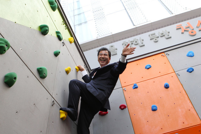서울 강동구의회 성임제 의장(서울시 구의회의장협의회 회장)은 최근 ‘강동진로직업체험센터의 인공암벽장 준공식’에 참석해 직접 암벽등반 시범을 보였다.