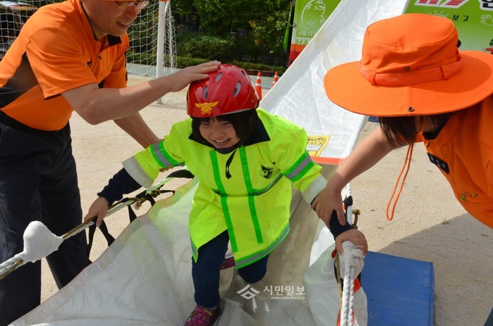 강남소방서는 최근 개일초등학교를 찾아 학생 120여명을 대상으로 '이동안전체험교실'을 운영했다. 사진은 경사하강식구조대를 활용해 탈출체험을 하고 있는 어린이의 모습.(사진제공=강남소방서)