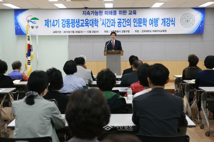 지난달 30일 서울 강동구 평생학습관 대강의실 3층에서 열린 ‘제14기 강동평생교육대학 - 시간과 공간의 인문학 여행’ 개강식에 참석한 이해식 구청장(가운데)이 인사말을 하고 있다.(사진제공=강동구청)