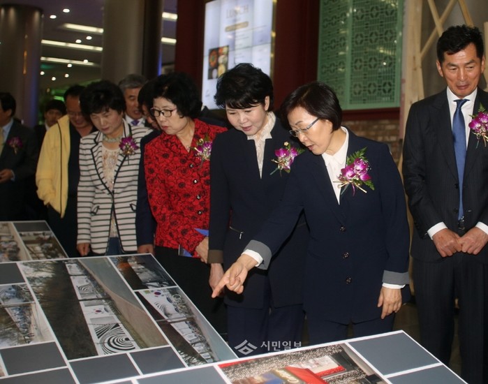 1일 오전 9시 서울 강남구 코엑스 1층 로비에서 열린 ‘강남구 아름다운 건축물 전시회’에 참석한 신연희 구청장(오른쪽에서 두 번째)이 내빈들과 함께 전시물을 둘러보고 있다.(사진제공=강남구청)