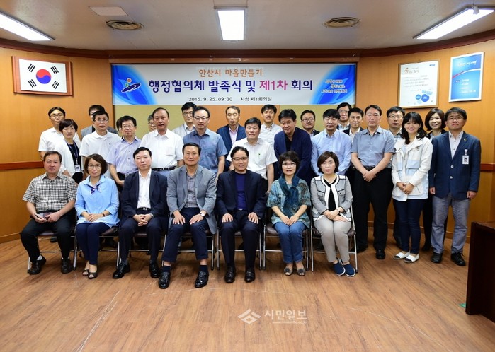 경기 안산시는 최근 마을만들기 사업의 부서간 협력시스템을 구축하기 위해 시청 제1회의실에서 최원호 부시장(아래 왼쪽에서 다섯 번째)과 시 관계자들이 안산시 마을만들기 행정협의체 발족식을 열고 있다.(사진제공=안산시청)