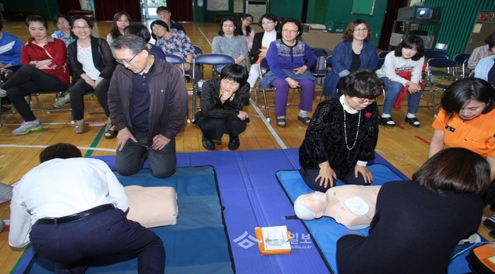 서울 동작소방서는 지난 1일 오후 2시 수도여자고등학교 교사 40여명을 대상으로 '응급처치법 교육'을 실시했다. 사진은 교육에 참가한 교사들이 심폐소생술 실습을 하고 있는 모습.(사진제공=동작소방서)