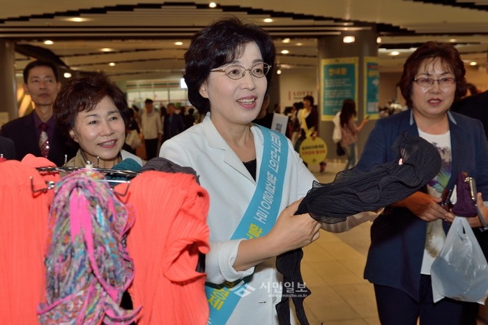 최근 송파구 잠실 롯데월드몰 지하광장에서 열린 우수중소기업 특별판매전 ‘서울바자축제’에 참석한 박춘희 송파구청장(가운데)이 시민들에게 제품을 홍보하고 있다. (사진제공=송파구청)