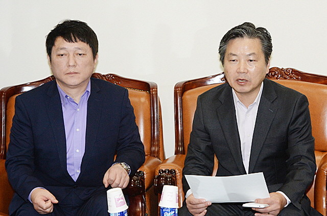 새정치민주연합 최재성(왼쪽) 총무본부장과 홍종학 디지털소통본부장이 4일 오전 서울 여의도 국회에서 국민예산마켓 관련 기자간담회를 하고 있다.
